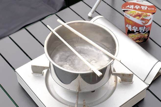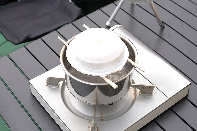 냄비에 물을 올리고 나무젓가락 2개를 올려주세요.