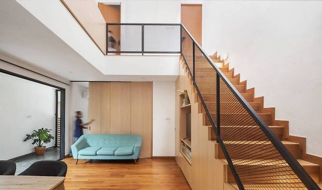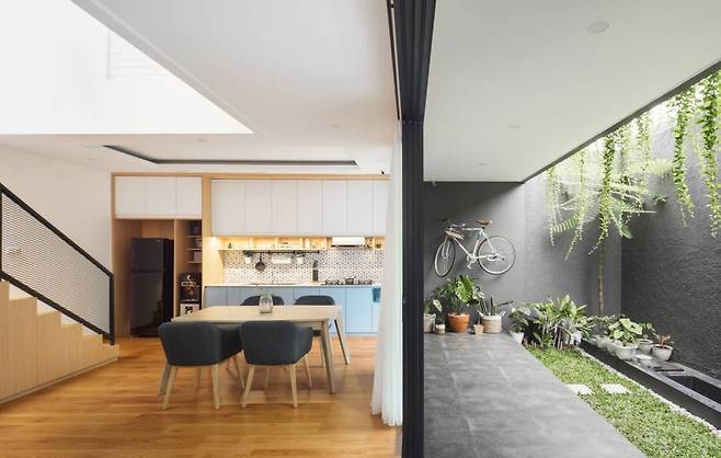 집의 중앙에는 작지만 강렬한 인상의 좁고 푸른 안뜰이 있다. 자연광의 흐름을 고려해 만든 이 공간은 하루 종일 부드러운 햇살로 가득 채워진다. 그리고 밤이 되면 뜻밖의 조도를 갖춘 조명 덕분에, 정적이면서도 로맨틱한 공간으로 변신한다.