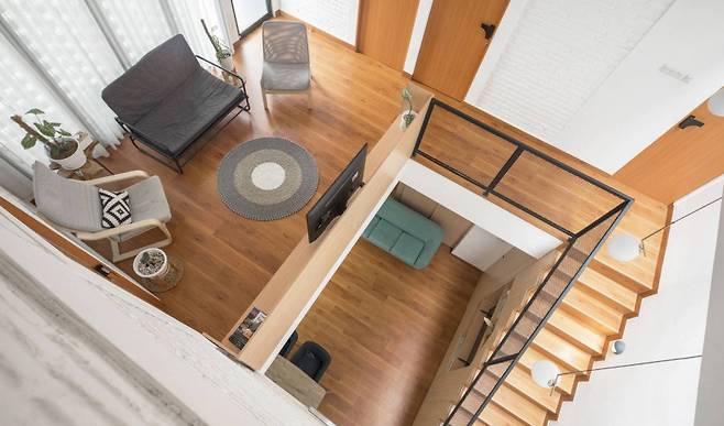 밖에서 느껴지는 묵직한 흑백의 외피와는 달리, 실내는 기대를 깨고 밝고 따뜻한 소재들로 채워져 있다. 나무와 순백색으로 꾸며진 실내는 높은 천장이 주는 개방감과 어우러져 한층 편안한 분위기를 만든다. 살림살이는 최대한 간결하게 정리되어 있고, 조명과 가구 모두에서 절제된 감각이 엿보인다.