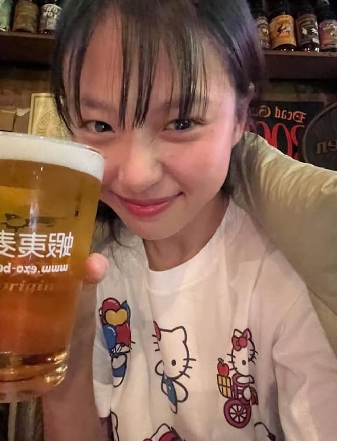 또한 실내에서 그녀는 그래픽 티셔츠로 내추럴하면서도 귀여운 룩을 완성했는데요. 귀여운 헬로키티 프린트 티셔츠에 두툼한 패딩을 매치해 편안하면서도 캐릭터가 돋보이는 캐주얼 룩을 완성했습니다.