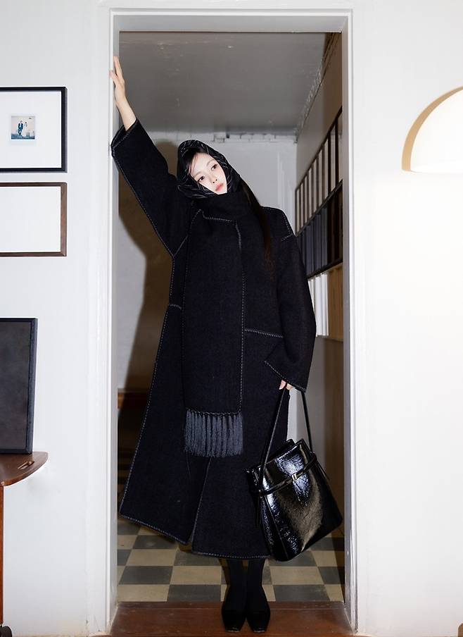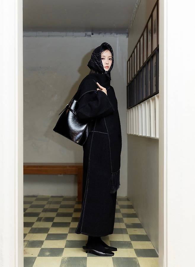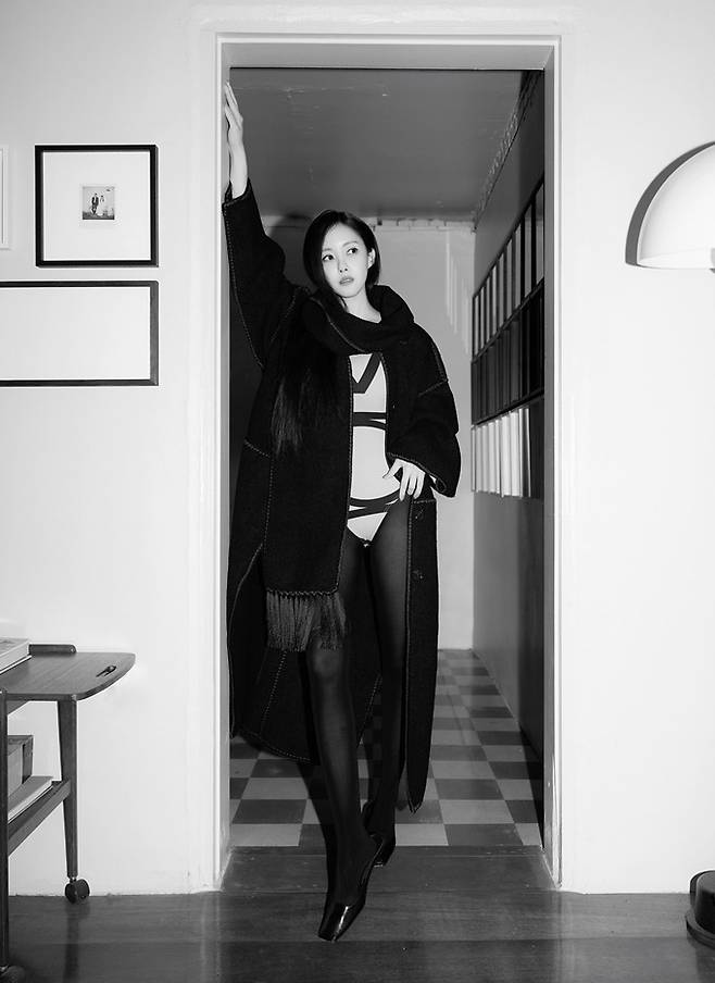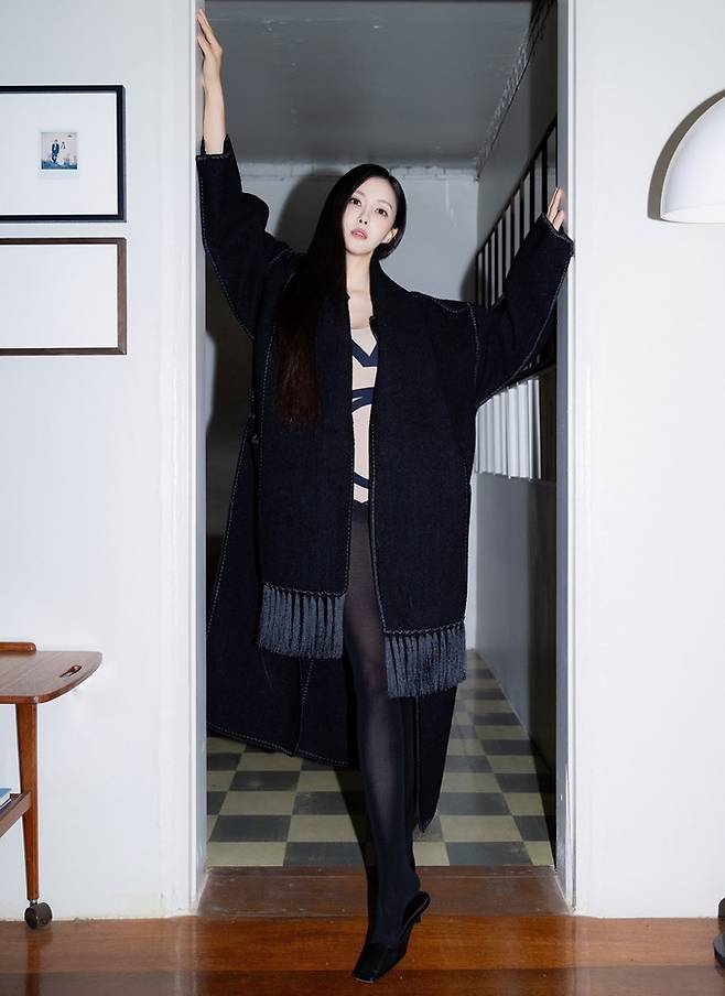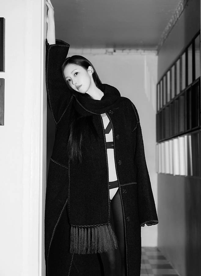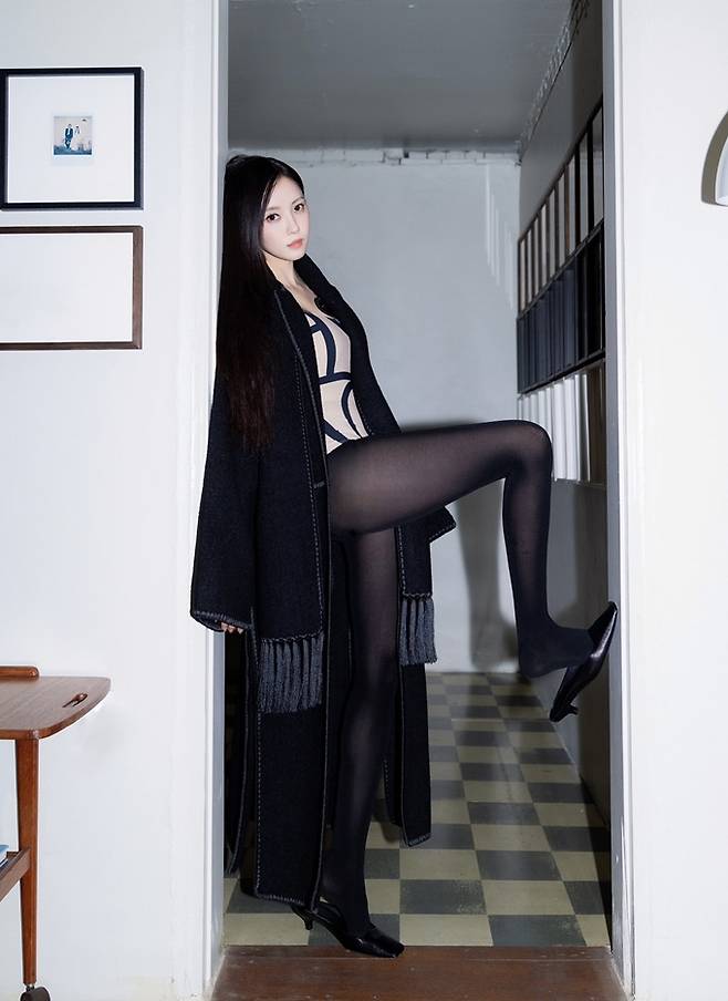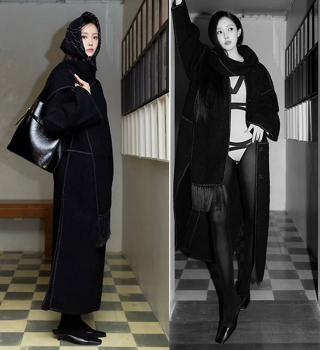 공개한 사진에서 효민은 섹시한 바디슈트 위에 프린지 블랙 롱 코트를 입고 머리에 스카프를 두른 섹시하면서도 고고한 가을 여자로 변신했다.