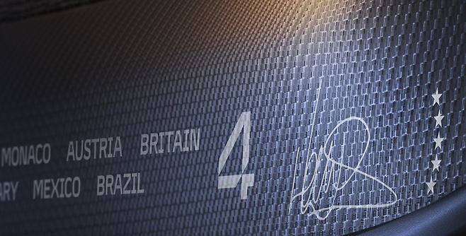 탄소 섬유로 제작된 문턱(도어 실)에 2025년 월드 챔피언 랜도 노리스와 그의 팀 동료 오스카 피아스트리의 진짜 친필 사인이 수작업으로 새겨져 있다.