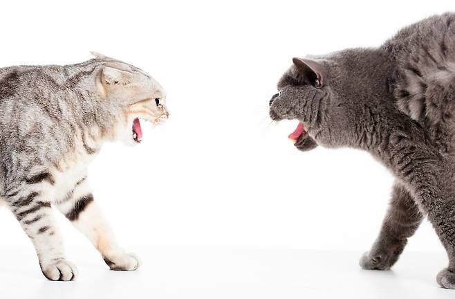 고양이끼리 심하게 싸우고 있다면, 큰 소리를 내고 공간을 분리 시켜야