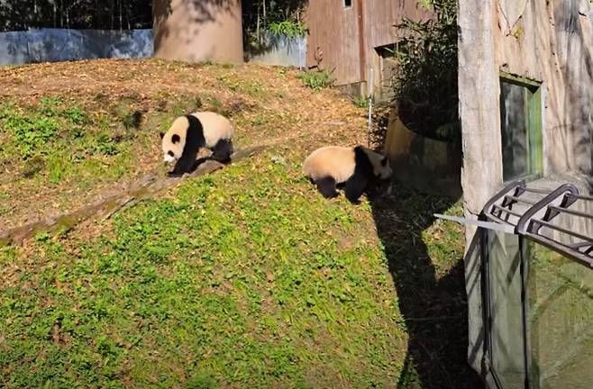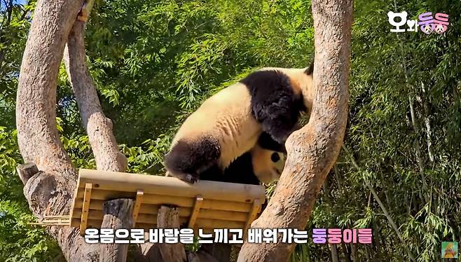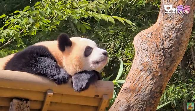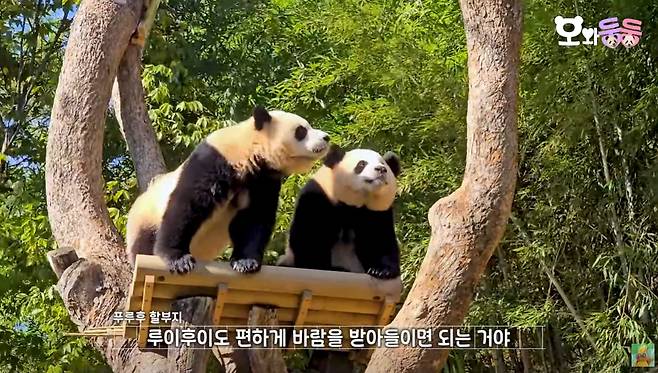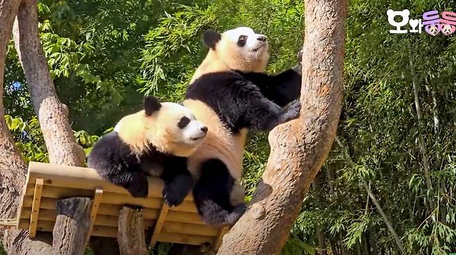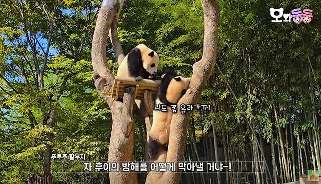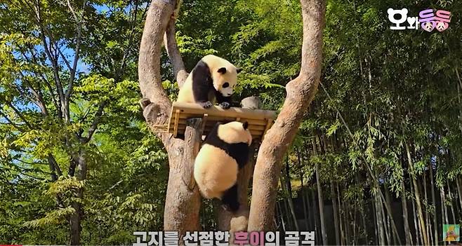 지난 28일 공개된 에버랜드 유튜브 말하는동물원 뿌빠TV에는 루이후이의 야외 방사장 라이프가 공개됐습니다. 영상에서 푸스빌을 먼저 차지한 후이는 올라오려는 루이 언니를 괴롭히며 귀여운 매력을 뿜뿜했는데요. 푸바오 언니를 닮아 워낙 푸스빌을 좋아했던 루이는 동생의 방해에도 굳건하게 푸스빌에 올라아 동생과 나란히 자리를 잡았습니다.