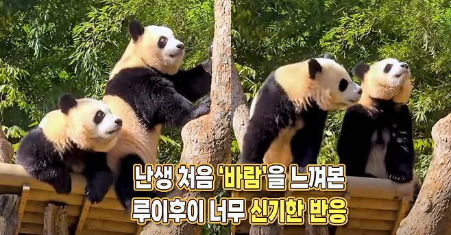처음 야외를 경험하는 쌍둥이 아이들은 모든 게 너무 신기합니다. 야외 방사장에 흐르는 물을 가지고 첨벙첨벙 놀기도 하고, 푸바오 언니가 쓰던 푸스빌에 올라와 한가로이 여유를 즐기기도 하는데요. 자연 속에 있어 더 이쁜 우리 루이후이는 난생 처음 경험하는 '바람'을 맞으면서도 아주 기특하고 이쁜 반응을 보여 화제를 모으고 있죠.
