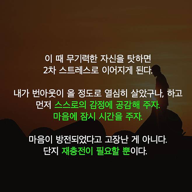 우리가 할 일은 스트레스 자체를 안 받으려는 노력보다는 스스로의 감정에 공감을 해줌으로써 1차 스트레스가 2차 스트레스로 번지지 않도록 하고 방전된 마음이 재충전을 할 시간을 주는 게 아닐까요.