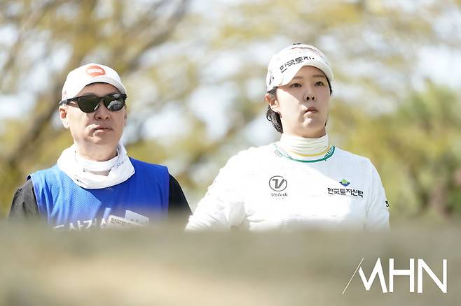 [mhn포토] 박지영, 캐디 송영철과 살피는 공략 지점