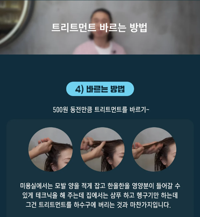 린스나 트리트먼트는 두피에 닿지 않도록 모발 중간~끝에만 바르세요.