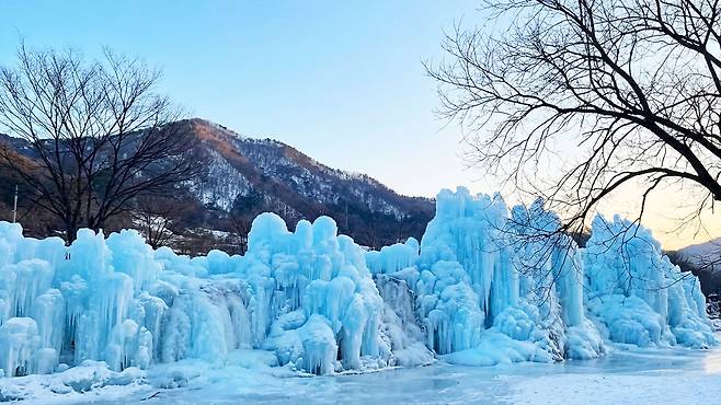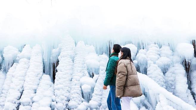 계곡물을 끌어 올려 만든 거대한 빙벽과 고드름 조형물이 2,500㎡ 규모로 펼쳐지는데요.