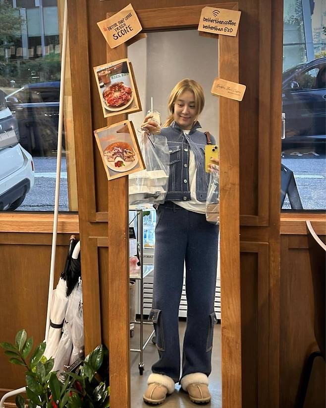 옥주현은 데님 재킷과 와이드 데님 팬츠를 활용한 캐주얼 룩을 선보였다. 재킷의 버튼 디테일과 팬츠의 포켓 장식이 룩에 독특함을 더하며, 부드러운 털 슬리퍼로 편안하면서도 트렌디한 분위기를 연출했다. 손에 든 음료와 쇼핑백은 일상의 여유를 느끼게 하며, 전체적으로 실용적이면서도 감각적인 스타일링이다.