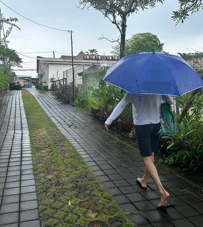 옥주현은 비 오는 날의 캐주얼한 산책 스타일로 눈길을 끈다. 흰색 긴팔 상의와 짧은 반바지를 매치해 편안함을 강조했으며, 맨발에 슬리퍼를 착용해 자연스러운 느낌을 더했다. 파란색 우산은 전체적인 룩에 생동감을 주며, 소지한 가방은 실용성과 스타일을 동시에 잡았다. 주변의 자연과 조화를 이루는 간결한 패션이 돋보인다.