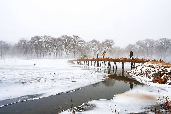 강을 가로지르는 섶다리는 눈 덮인 풍경과 어우러지며 마치 한 폭의 수묵화를 보는 듯한 감동을 줍니다.