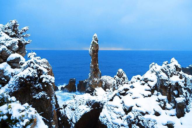 겨울철에는 촛대바위와 그 주변 바다가 얼음결을 머금어 더욱 차갑고 맑은 느낌을 줍니다.