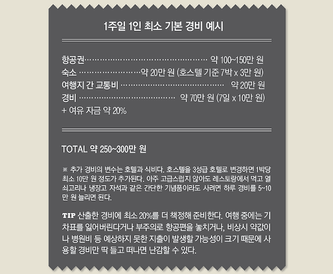 여행 스타일과 여정에 따라 예산은 천차만별이기 때문에 정답은 없습니다. 아래 예시는 최대 예산이니 참고해서 본인의 경비를 예상해 보세요.