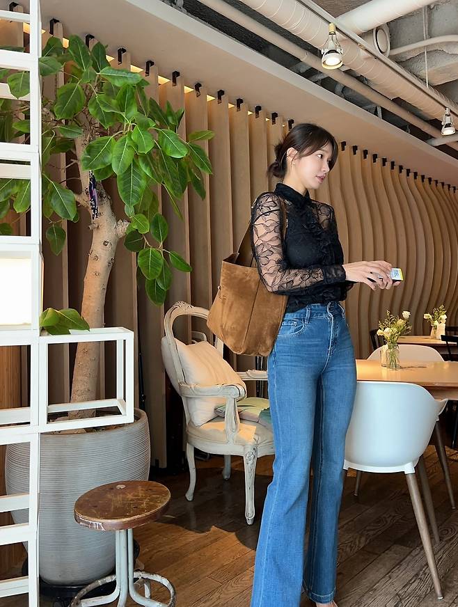 우드 패널과 그린 플랜트가 포인트인 카페에서 찍은 오또맘의 인스타그램 사진이 눈길을 끈다. 블랙 레이스 블라우스와 하이웨스트 데님, 스웨이드 토트백 조합으로 담백한 데일리룩 속에서도 ‘건강미’ 키워드를 다시 한 번 각인시킨다.