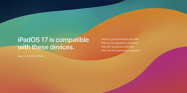 이러한 iPadOS17 버전은 아이패드 6세대, 아이패드 미니 5세대, 아이패드 에어 3세대, 아이패드 프로 2세대부터 사용할 수 있습니다. 역시 2018년 출시된 모델부터 지원하기 때문에 기존 모델을 사용하시는 분들 중 상당수 분들이 지원받을 수 있게 되었습니다. 아이패드 프로 1세대, 아이패드 5세대 모델이 이번에 지원 모델에서 제외되었습니다.