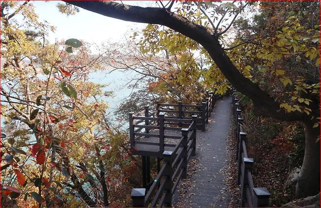 배알도의 최고 높이는 해발 약 25m, 섬 전체를 도는 둘레길은 약 500m 남짓으로 부담 없이 걸을 수 있습니다. 길은 전체적으로 평탄하게 조성되어 있어 아이부터 어르신까지 누구나 편안하게 산책할 수 있습니다. 늦가을에는 낙엽이 폭신하게 깔려 걷는 소리마저 부드럽게 들리는 계절입니다.