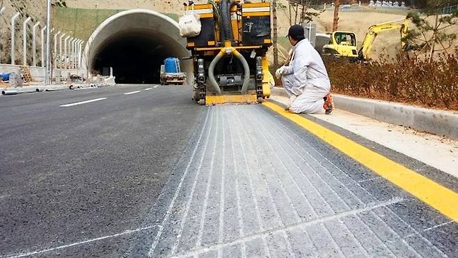 그루빙은 빗길 주행 시 발생하는 수막현상(Hydroplaning)을 방지하기 위해 도로에 일정 간격으로 세로 홈을 파는 공법이다.