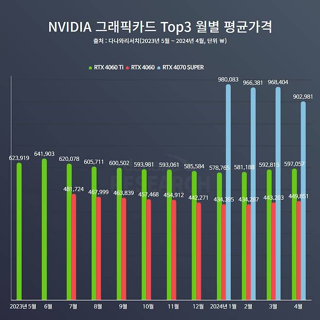 NVIDIA RTX 40 SUPER 시리즈의 약진이 예사롭지 않다. 그동안 애매모호한 네이밍에 극악의 가격 정책으로 구설수에 올랐던 NVIDIA의 그래픽 카드는 유저들에게 울며 겨자 먹기로 구입해야 하는 눈물의 아이템이었다. 하지만, 이런 전 세계 유저들의 원성을 조금이나마 들었는지, NVIDIA는 올해 1월 SUPER라는 이름표를 단 라인업을 새로 출시하며 면죄부를 얻으려 노력하고 있다. 이에 SUPER 시리즈가 나오기 직전 NVIDIA 그래픽 칩셋별 점유율을 소개한 바 있는 다나와 차트뉴스는 다시금 다나와 리서치 자료를 통해 어떠한 변화가 있었는지 알아보고자 한다. 과연 SUPER가 던진 돌은 그래픽 카드 시장을 얼마나 큰 파장을 불러왔을까?