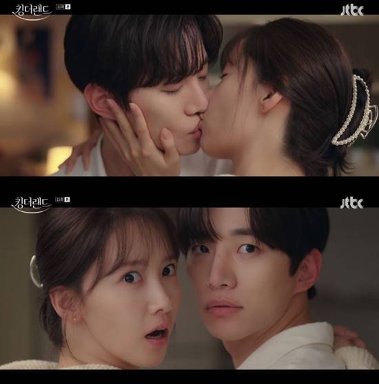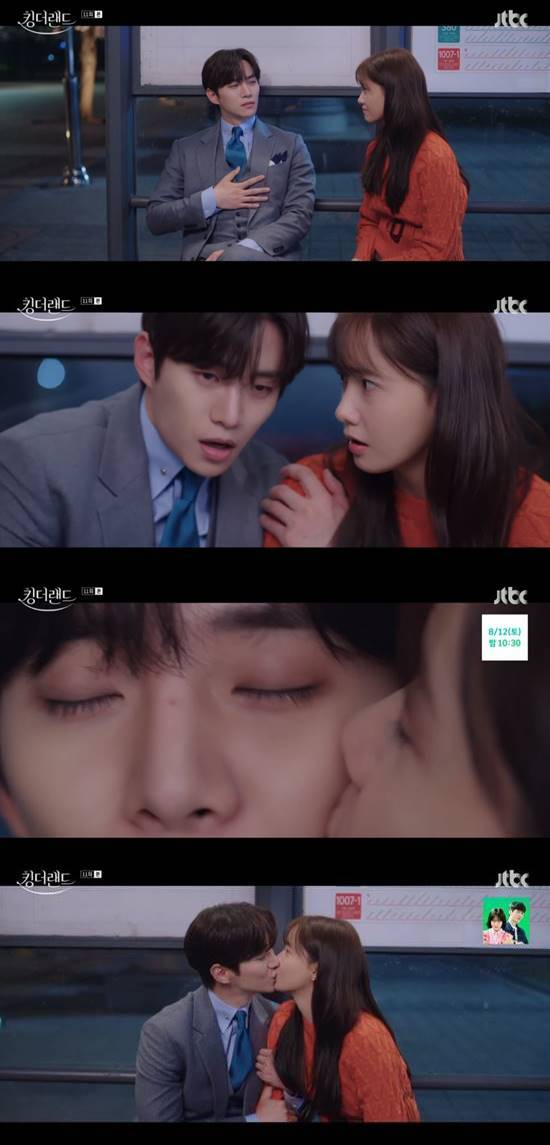 22일 방송한 JTBC 토일드라마 '킹더랜드' 11회에서는 킹호텔 본부장 구원(이준호 분)과 킹그룹 1등 사원 천사랑(임윤아)이 입맞춤을 하는 장면이 전파를 탔다.
