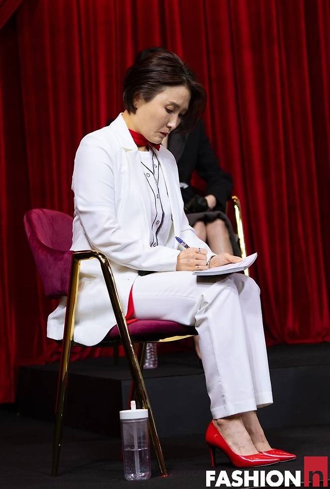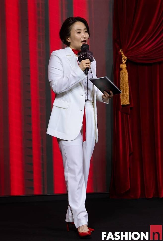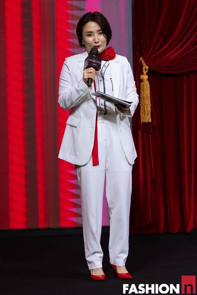 박경림은 이날 화이트 재킷과 팬츠로 구성된 슈트룩으로 눈길을 끌었다. 여기에 빨간 머플러와 구두로 포인트를 주었다.