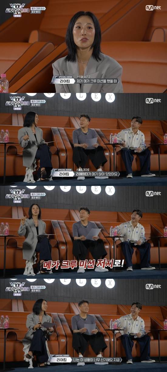 메가 크루 미션의 심사위원으로 참여하게 된 리아킴은 "내가 메가 크루 (미션을) 했을 때 리에하타가 메가 크루 저지로 앉아 있었다. 내가 그 자리에 앉아 있고 리에하타가 (메가 크루 미션을) 하는 이 상황이 너무 신기하다. 얼마나 힘들었을까"라며 심사위원으로 합류하게 된 소감을 밝혔다.