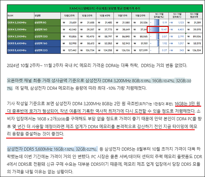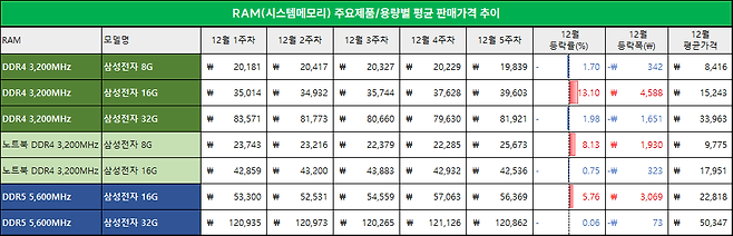 오픈마켓 채널 최종 거래 성사금액 기준으로 삼성전자 DDR4 3,200MHz 8GB(-1.70%), 16GB(+13.10%), 32GB(-1.98%). 삼성전자 DDR5 5,600MHz 16GB(+5.76%), 32GB(-0.06%). 단, DDR5는 위 본문에서 상술했듯 12월말 이후에도 가격이 가파르게 오르고 있으므로 가격 변동에 유의할 것.