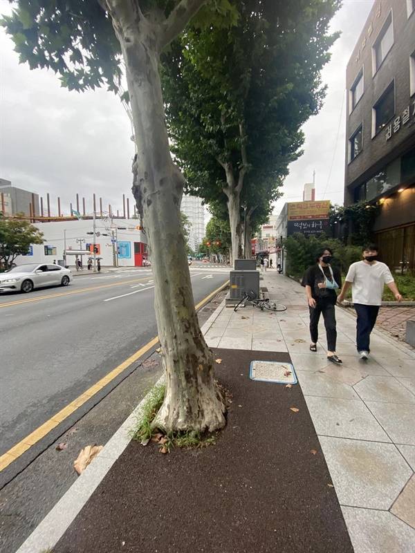 대구 중구 가로수는 나무 주변까지 모두 콘크리트로 덮여 있었다. 보통 가로수는 정사각형 땅에 심어 비가 오면 그곳을 통해 최소한 빗물이라도 머금을 수 있게 만들어둔다. 심지어 그 공간도 너무 좁아 면적을 더 넓혀주거나, 포장이나 인도 블록 없이 가로수들로 길게 연결된 화단을 만들기도 한다.
