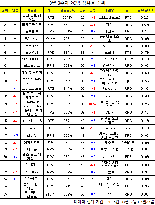 한 주간의 PC방 순위를 되짚어 보고, 어떤 변화가 있었는지 알아보는 'PC방순위' 코너입니다. 데일리게임은 매주 PC방 순위를 일목요연하게 정리, 독자들이 알아보기 쉽도록 제공합니다. 지난 한 주간 어떤 PC 온라인게임들이 눈길을 끌었는지 살펴봤습니다. < 편집자주 >