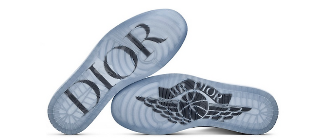 고급스러운 그레이 색상의 가죽 소재를 사용했고 측면 스우시에는 디올의 시그니처인 오블리크 패턴이 들어갔다. 갑피 측면에는 조던과 디올의 협업을 의미하는 'AIR DIOR' 로고가 들어갔고 반투명한 밑창에는 ‘DIOR’이 크게 프린팅된 것이 특징.