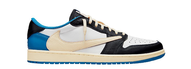 미국의 랩 스타 트래비스 스캇과 디자이너 브랜드 프라그먼트 그리고 나이키가 협업해 내놓은 운동화이다. 조던 1 로우의 쉐입에 트래비스 스캇의 시그니쳐인 뒤집힌 나이키 로고와 함께 프라그먼트의 시그니처 색상 블루가 들어갔다. 여기에 스마일 페이스 로고와 음각으로 번개 무늬 디테일도 담겨있다.