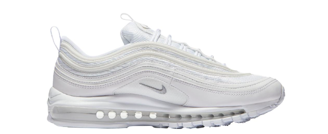 나이키 에어 맥스 97은 1997년에 출시된 운동화로 일본의 고속열차 신칸센에서 영감을 받아 디자인되어 스포티한 느낌을 물씬 준다. 평소에 스트릿 룩이나 애슬레저 룩을 입는다면 나이키 에어 맥스 97 트리플 화이트 울프 그레이 모델이 적합하다. 농구화로 제작된 만큼 착화감은 호불호가 있는 편이다.