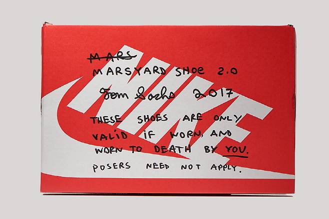 나이키 x 톰 삭스 마스야드 슈 2.0 스페이스 캠프의 신발 박스에는 이런 문구가 적혀있다. “THESE SHOES ARE ONLY VALID IF WORN, AND WORN TO DEATH BY YOU(이 신발은 마르고 닳도록 신을 사람에게만 유효하다). 문구와 달리 최근 리셀 가격은 제품명처럼 우주에 가 있는 상태라 마르고 닳도록 신기는 어렵다.