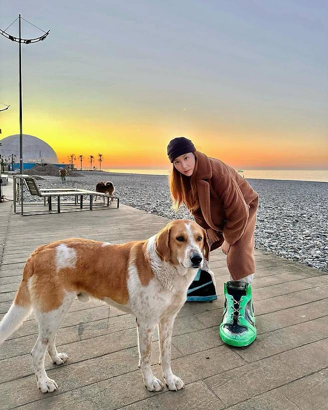 노을이 지는 해변가에서 브라운 컬러의 테디베어 코트를 착용하여 포근하면서도 멋스러운 겨울 패션을 완성했다. 무릎 아래까지 내려오는 긴 기장감의 코트는 보온성을 챙기면서도 풍성한 실루엣을 연출한다. 여기에 심플한 블랙 비니를 매치해 캐주얼한 무드를 더했으며, 발목을 덮는 그린과 블랙 컬러 조합의 독특한 부츠로 전체적인 룩에 생동감 넘치는 포인트를 주었다.