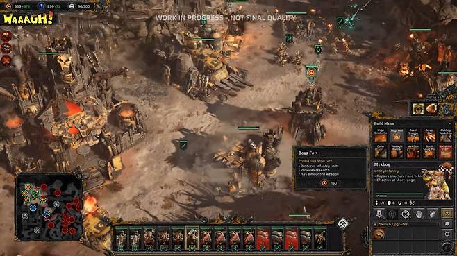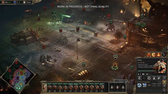 이와 함께 실제 플레이 영상도 짧게 공개되었다. 영웅 유닛인 사이러스가 직접 전투에 참여하는 장면을 볼 수 있으며, 드랍 포드로 등장하는 스페이스마린, 하늘에서 때려박는 그린스킨의 건물들도 볼 수 있다.
