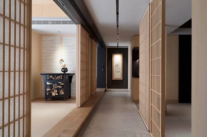 삼나무와 격자 패턴의 복도는 공간을 자연스럽게 구분하며 따뜻한 분위기를 더해준다. 부드러운 패턴의 카펫과 아담한 가구들이 조화를 이뤄 가족이 함께 시간을 보내기 좋은 아늑한 공간이 완성된다.