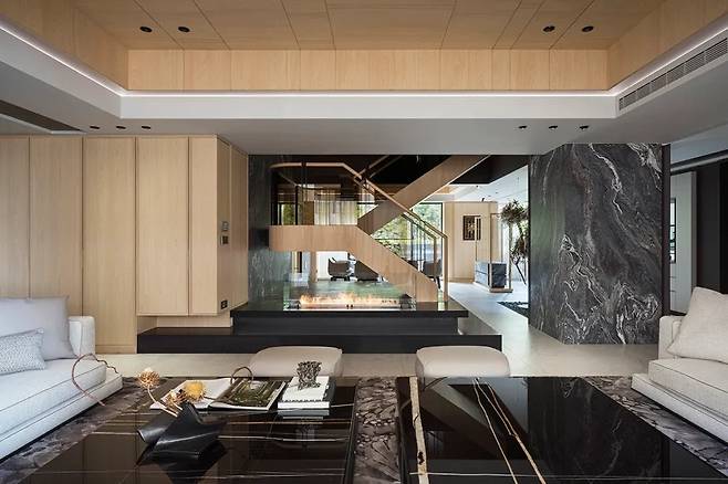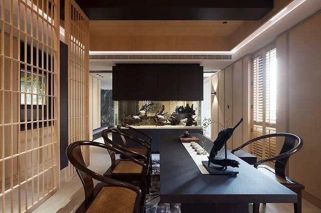 주방과 연결된 다이닝 공간은 동양과 서양의 미니멀리즘 디자인이 자연스럽게 조화를 이룬다. 대리석 아일랜드가 중심이 되어 요리와 식사가 함께 이루어지며, 가족과 친구들이 모이기 좋은 구조로 계획되었다.
