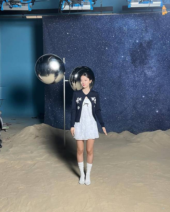흰색 원피스에 블랙 리본 디테일, 그 위로 얹은 네이비 카디건은 고전적인 감성과 소녀스러움을 동시에 품는다. 발목 위까지 올라오는 화이트 삭스와 플랫 슈즈는 슬기의 순수한 분위기를 배가시킨다. 배경은 모래 위에 세워진 별빛 가득한 밤하늘. 마치 달 표면에 앨리스가 착륙한 듯한 연출이다.