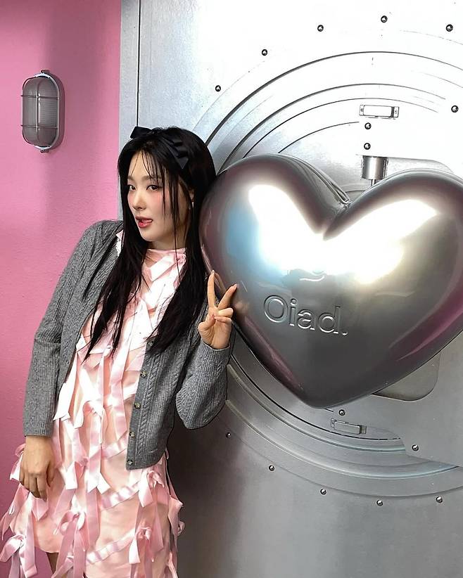 이어지는 사진에서 슬기는 분홍빛 리본이 흩날리는 드레스를 입고 회색 카디건을 걸쳤다. 벽면을 가득 채운 핑크색과 금속 하트 조형물이 포인트. 머리 위 리본과 함께 연출한 헤어스타일은 마치 토끼를 따라 뛰어가는 앨리스를 연상케 한다. 슬기의 사랑스러움이 과감한 텍스처 속에서 자연스럽게 피어난다.