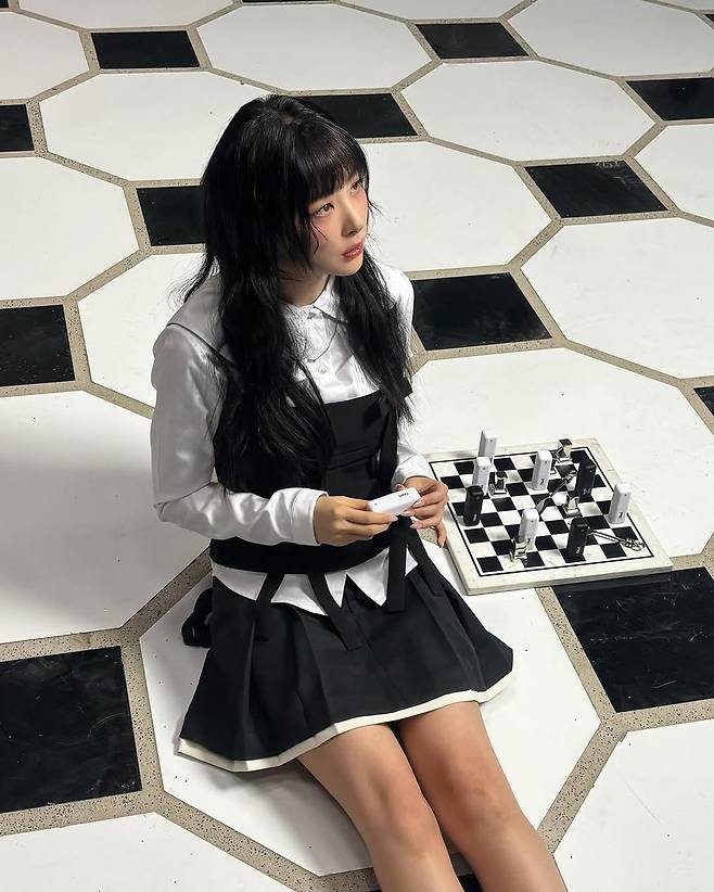 체스판 위에 앉은 또 다른 장면은 전환점이 된다. 블랙과 화이트로 정갈하게 나뉜 타일 위, 슬기는 교복 스타일의 원피스를 입고 마치 말 없는 질문을 던진다. 소녀와 숙녀의 경계에 선 슬기만의 분위기가 공간을 지배한다. 체스말 대신 정체불명의 실린더 오브제가 어지럽게 놓여있다. 정답 없는 게임처럼 그녀는 이 세계에서 질문을 던진다.