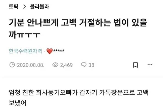 한 커뮤니티에 기분 안 나쁘게 고백 거절하는 법을 알려달라는 게시물이 화제다. 친한 회사 동기 오빠가 카톡으로 고백했지만, 작성자의 스타일이 아니라서 거절해야 하는 상황이다. 글만 읽어도 답답함이 느껴진다.