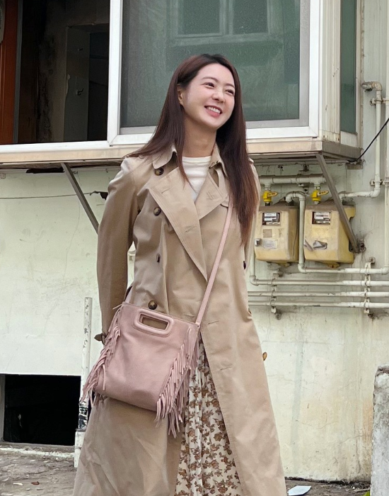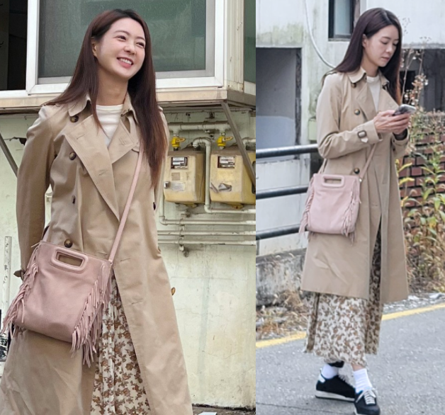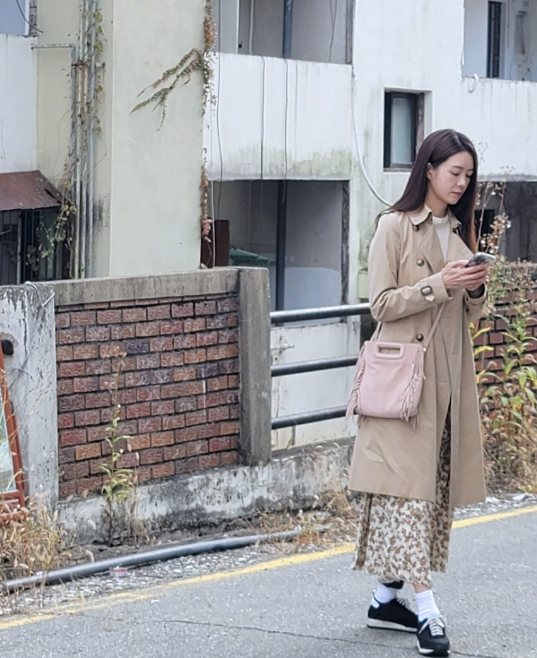 이요원은 트렌치코트와 꽃무늬 원피스를 매치하여 캐주얼하면서도 세련된 스타일을 선보였습니다. 핑크색 크로스백과 운동화를 더해 편안하면서도 스타일리시한 느낌을 강조하며, 전체적으로 여성스러우면서도 활동적인 매력을 발산했습니다.
