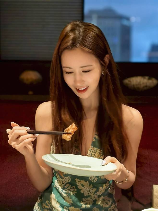 이어지는 사진에서는 화려한 패턴의 롱드레스를 입고, 세븐과 나란히 앉아 익살스러운 미소를 지으며 달달한 분위기를 연출한다.