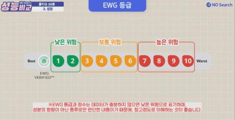 EWG 스킨딥 등급은 각 성분에 대해 10단계로 점수를 매기고, 낮은 위험(초록), 보통 위험(주황), 높은 위험(빨강) 3가지로 분류합니다. 이 중 보통 위험과 높은 위험에 해당되는 성분을 포함하고 있는지를 확인해 보았습니다.