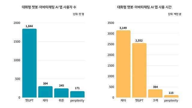 8월 와이즈앱·리테일 조사 결과, 한국인이 가장 많이 사용하는 AI챗봇 서비스는 ‘챗GPT(1천844만명)’, 가장 사용 시간이 긴 서비스는 ‘제타(3천149백만 분)’인 것으로 드러났다.