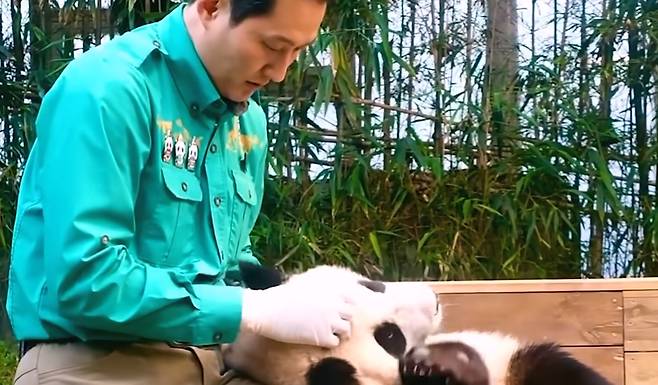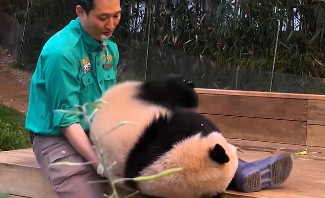 마치 할부지의 생일을 알고 축하라도 해줬던 것일까요? 후이바오는 송바오에게 고개를 묻으며 애교를 부렸고 할부지의 발을 잡고 놓지 않으며 사랑을 표현해줬습니다. 또 송 사육사의 마사지에 배를 발라당 까고 누우며 할부지의 눈을 마주치고 '꽁냥꽁냥' 시간을 보내기도 했는데요.