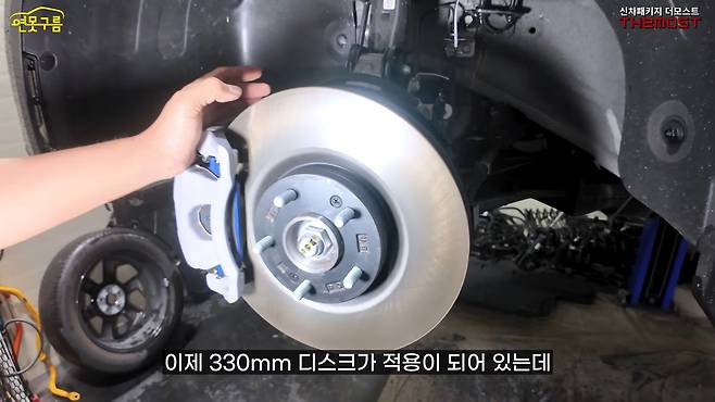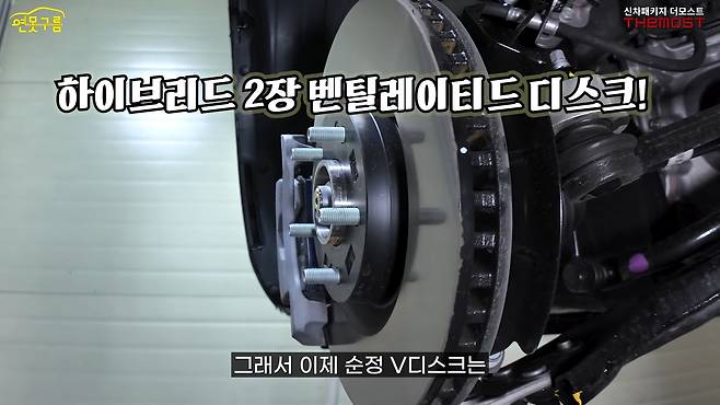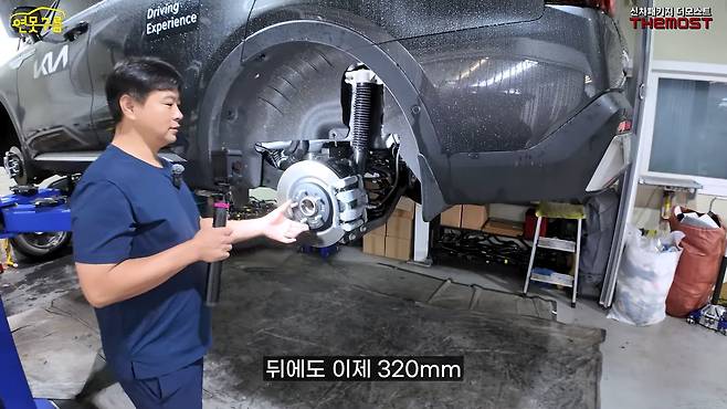 후륜 브레이크 시스템도 살펴보겠습니다. 쏘렌토 초기 모델을 보면서 인상 깊었던 기억이 나는데요. 후륜에도 320mm 브레이크 시스템이 적용되어 있습니다. 특히 하이브리드 차량에는 뒤쪽에 벤틸레이티드 방식의 2장짜리 V 디스크가 들어갑니다. 이는 방열 성능을 높이기 위한 것으로, 두 장의 디스크가 붙어 있는 방식입니다. 순정 V 디스크는 방열판에 특별한 바람 방향이 지정되어 있지 않아 양쪽이 바뀌어도 문제가 없는 타입이지만, 하이브리드 모델에는 이러한 방식이 적용되어 있다는 점이 흥미롭습니다.