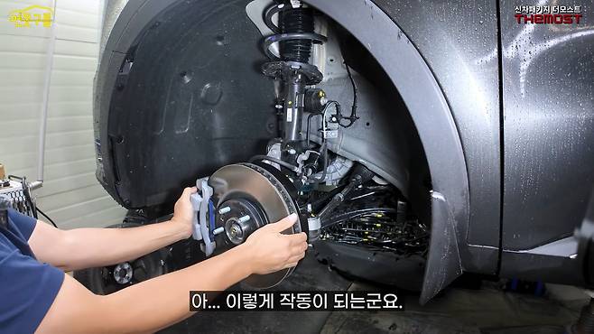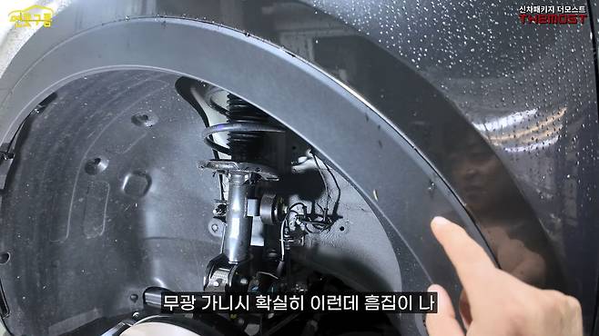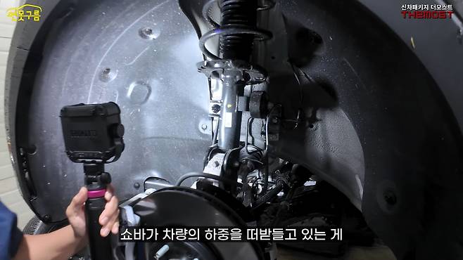 전륜 서스펜션은 맥퍼슨 스트럿 구조로 되어 있습니다. 이 맥퍼슨 스트럿 구조는 쇼바가 차량의 하중을 직접적으로 지지하는 방식입니다. 전륜 구동 기반 차량에서 이 구조를 많이 사용하는 이유는 구조가 비교적 단순하여 실내 공간을 넓게 확보할 수 있다는 장점 때문입니다. 그런데 이 맥퍼슨 스트럿 방식은 핸들을 돌리면 쇼바도 함께 따라 돌게 됩니다. 바퀴를 돌리면 쇼바가 같이 작동하는 것을 볼 수 있습니다.