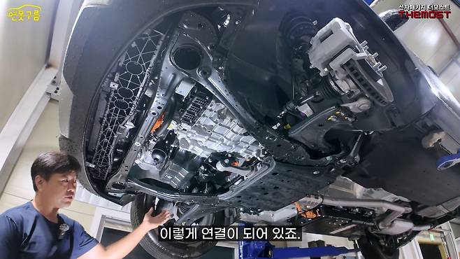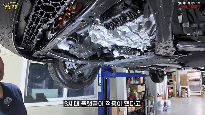 3세대 플랫폼이 적용되면서 이전의 'H'자 타입 크로스 멤버가 아닌, '우물 정(井)'자 타입으로 완전히 감싸는 형태로 변경되었습니다. 사각형으로 견고하게 연결된 이 구조는 충돌 테스트 시 충격을 훨씬 강하게 버텨주는 힘을 제공할 뿐만 아니라, 하체가 튼튼해지면서 주행 느낌 또한 한층 향상시킵니다. 엔진과 변속기가 나란히 배치되어 있는데, 처음 보면 어떤 것이 엔진이고 어떤 것이 변속기인지 헷갈릴 수 있습니다.