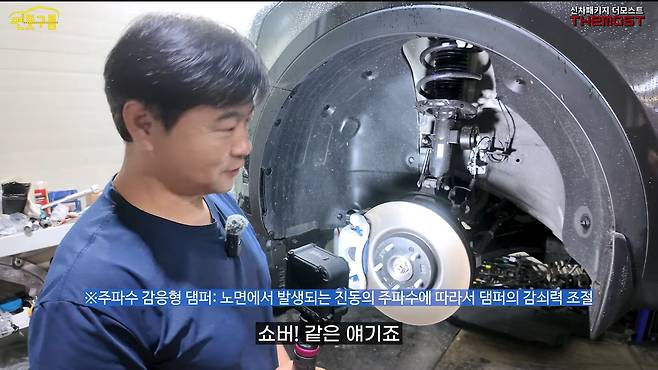 이 주파수 감응형 댐퍼는 흔히 '쇽업쇼버' 또는 '쇼바'라고 불리는 것과 같은 개념이지만, 좀 더 진보된 기술이라고 이해하시면 됩니다. 우리 눈에 보이는 쇼바 피스톤 쪽이 바로 이 댐퍼에 해당되는 부분입니다.